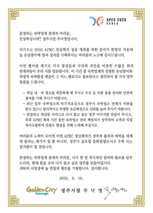 주낙영 시장은 “APEC 정상회의는 경주가 세계적인 도시로 발돋움할 수 있는 중요한 기회”라며 “숙박업소 관계자들의 협조와 시민들의 따뜻한 환대가 성공적인 회의 개최의 밑거름이 될 것”이라고 말했다...